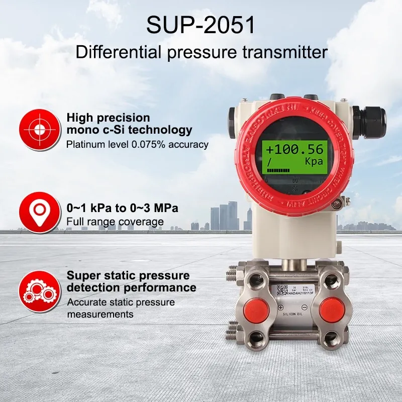 Cảm biến chênh áp SUP-2051 sử dụng công nghệ chênh lệch áp suất silicon đơn tinh thể hiệu suất cao, đo chính xác chênh lệch áp suất, mức chất lỏng hoặc lưu lượng, và truyền tín hiệu đầu ra tỷ lệ 4-20 mA. Phạm vi phát hiện đầy đủ từ 1kPa đến 3MPa. Thiết kế kiểm tra áp suất tĩnh hiệu suất cao, sai số áp suất tĩnh ± 0,05% / 10MPa.