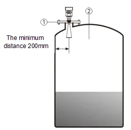 Được lắp đặt trong đường kính 1/4 hoặc 1/6. Lưu ý: Khoảng cách tối thiểu từ thành bồn chứa phải là 200mm. Lưu ý: ① điểm chuẩn ② Tâm bồn chứa hoặc trục đối xứng